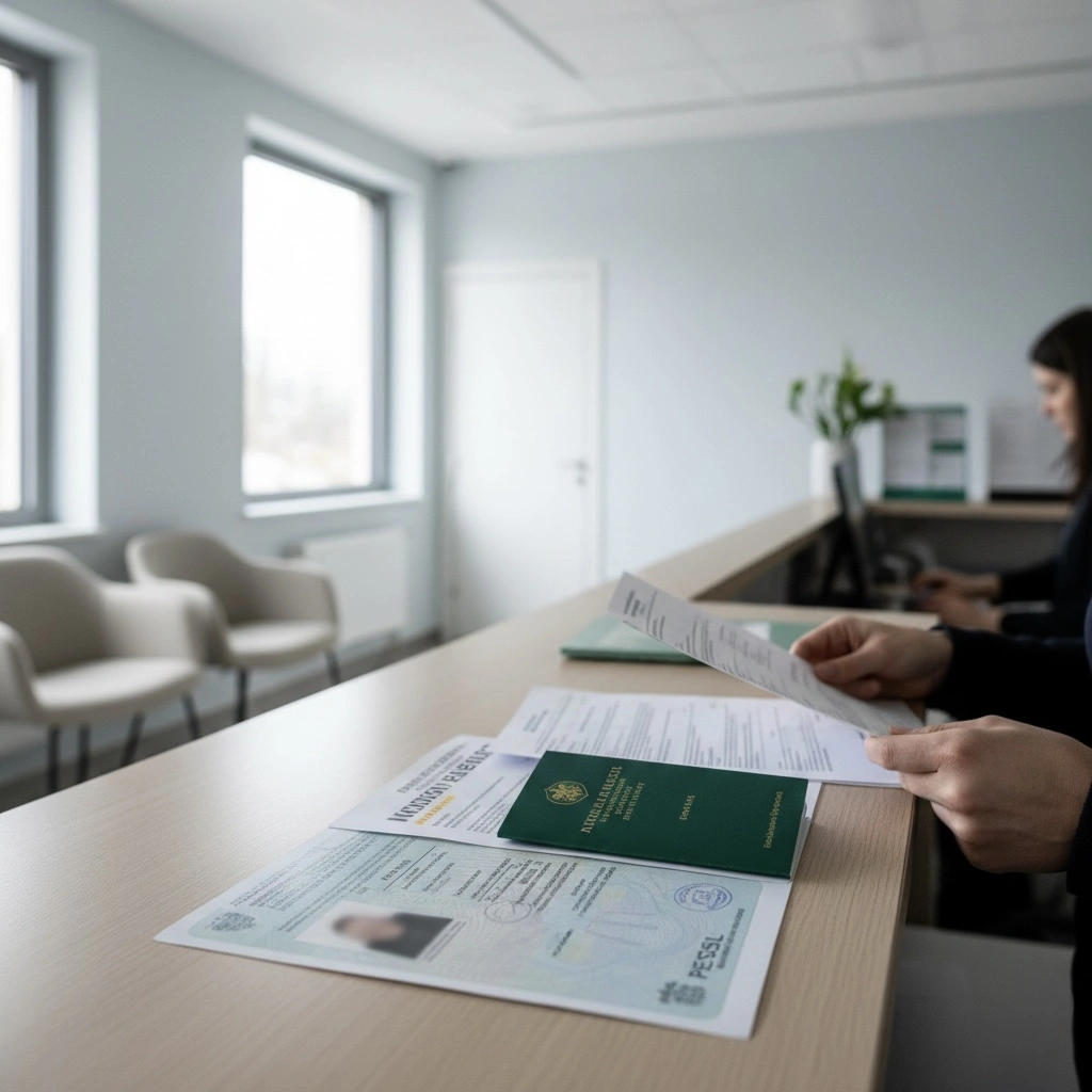Зберіть паспорт, документ про підставу перебування в Польщі (дозвіл на проживання, PESEL UKR або інший), довідку про попереднє страхування (якщо було).